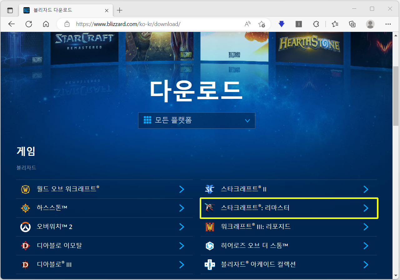 위에 링크로 들어가서 스타크래프트 리마스터를 클릭합니다.