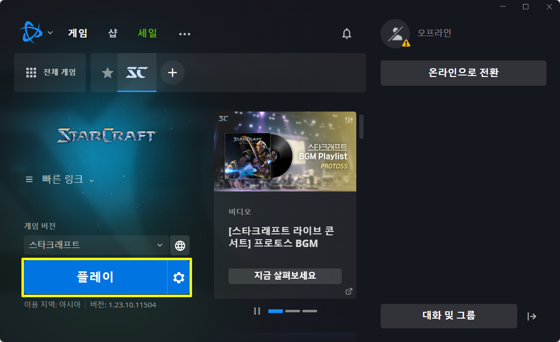 '플레이' 버튼을 클릭하면 스타크래프트가 실행됩니다.