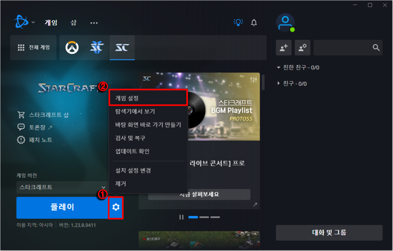 스타크래프트 플레이 톱니바퀴를 눌러서 게임 설정에 들어갑니다.