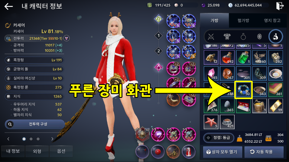 가방에 '푸른 장미 화관' 50개가 있어야 퀘스트가 진행됩니다.