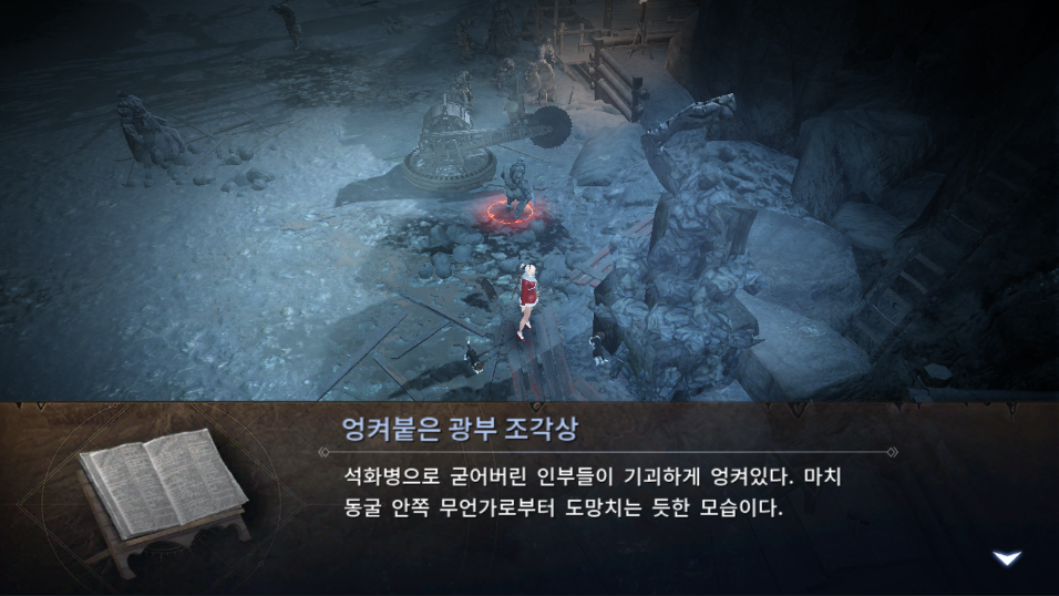 석화병으로 굳어버린 인부들이 기괴하게 엉켜있다.