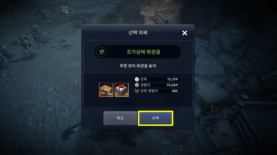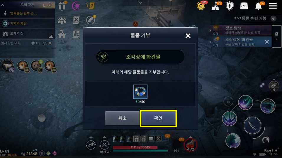 '조각상에 화관을 - 푸른 장미 화관'을 놓자 퀘스트를 클릭합니다.