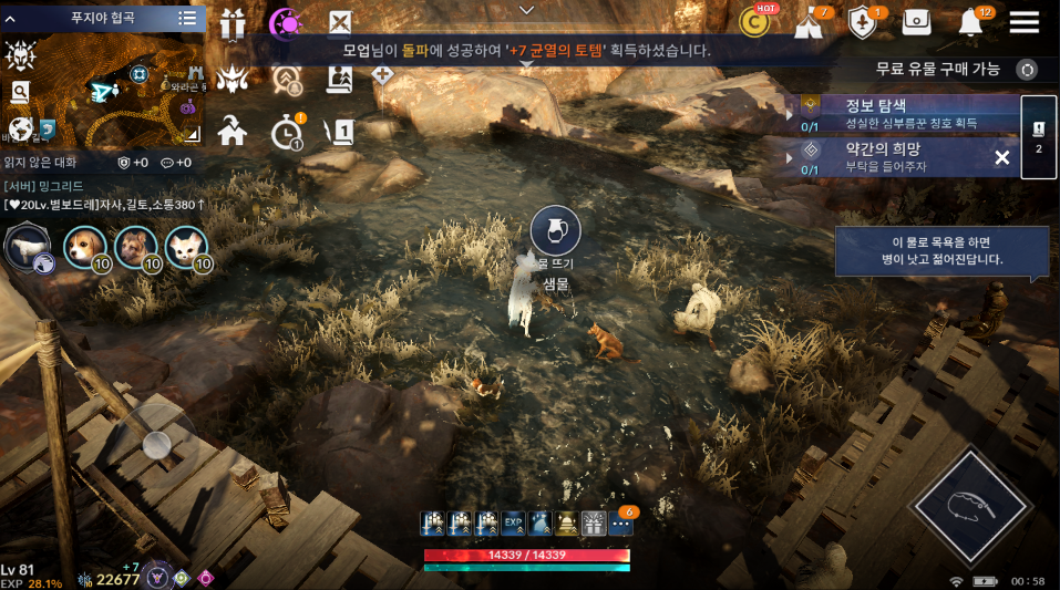 물 뜨기 버튼을 누르면 첫번째 퀘스트가 완료 됩니다.
