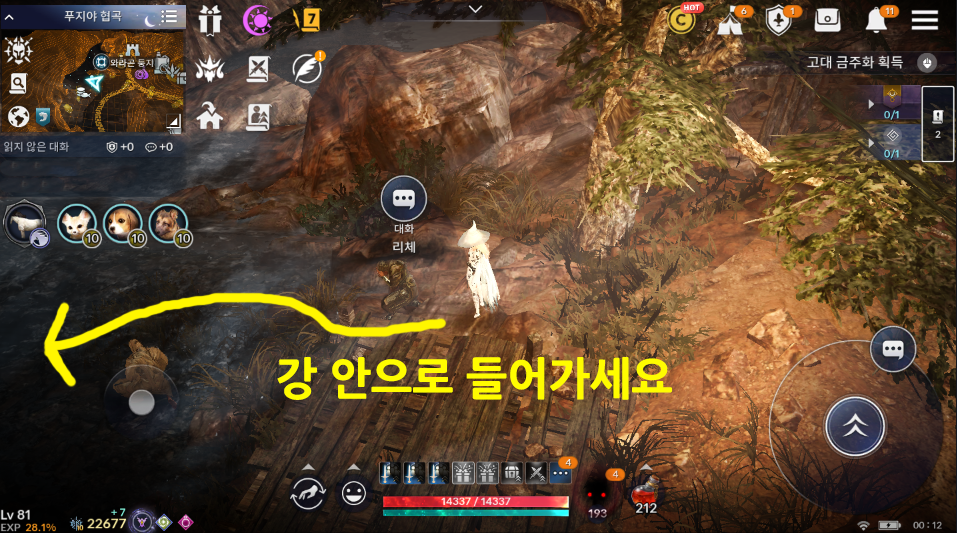 강 중앙쯤 들어가면 물 뜨기 버튼이 생깁니다.