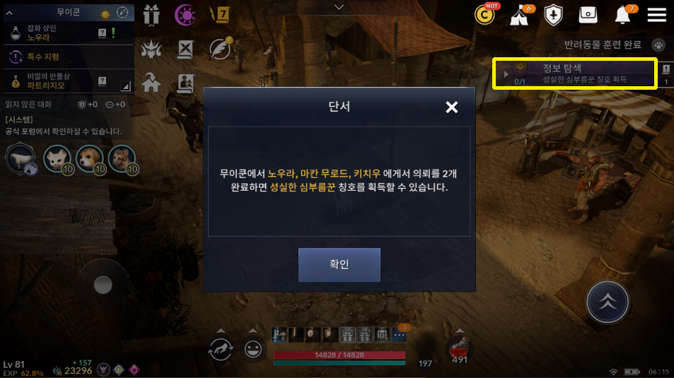 [검은사막 모바일 퀘스트] 정보 탐색 - 성실한 심부름꾼 칭호 획득