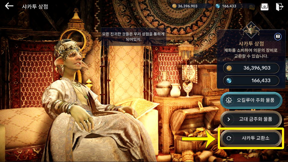 장신구와 유물은 샤카투 상점에서 다른 종류로 교환할 수 있습니다.