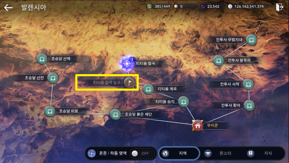 월드맵 → 발렌시아 남부 → 티티움 협곡 입구 → 혼돈의 균열 감시자