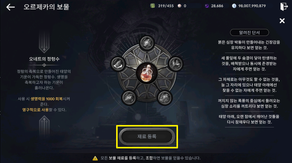 3. 오네르트의 정령수 만들기 위해서 5가지 재료가 필요합니다.