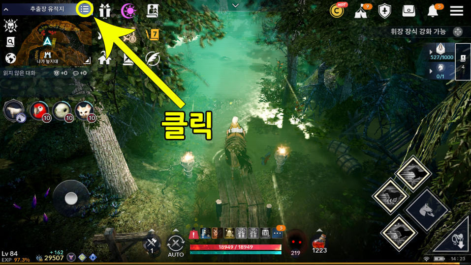 미니맵 줄3개 누릅니다.