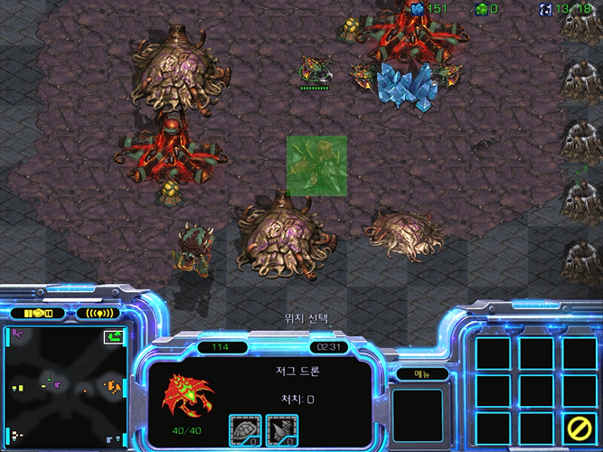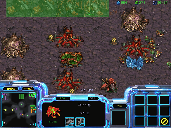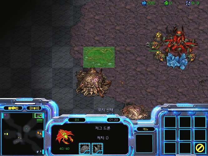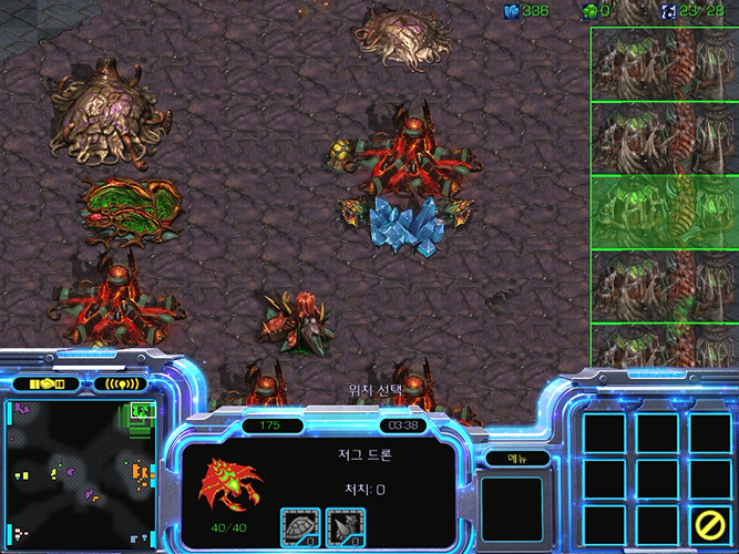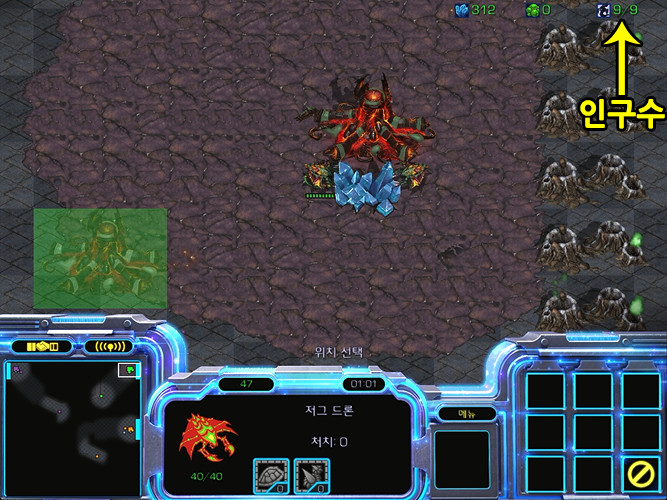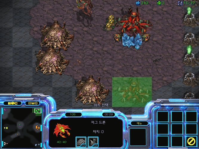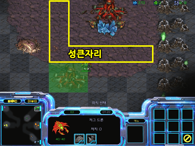 적팀 저그가 가까이 있을 경우에는 스포닝풀을 먼저 지어야 초반 저글링과 성큰러쉬를 막을 수 있습니다