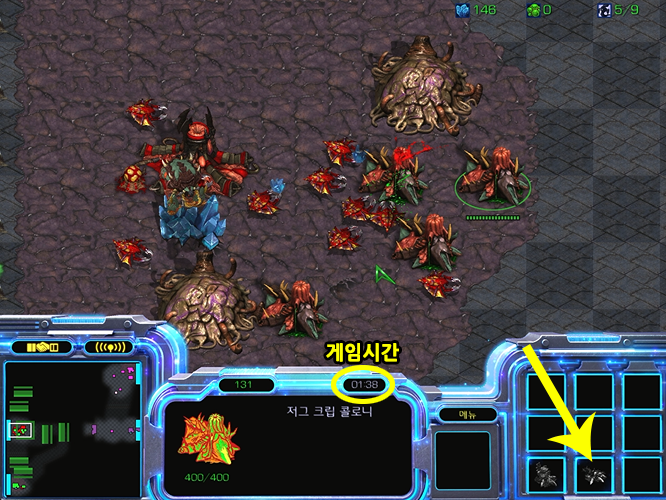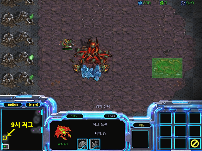 ⑥ 9시가고 있는 드론 4마리를 한마리씩 선택해서 적팀 저그 땅에 크립 콜로니를 지어줍니다
