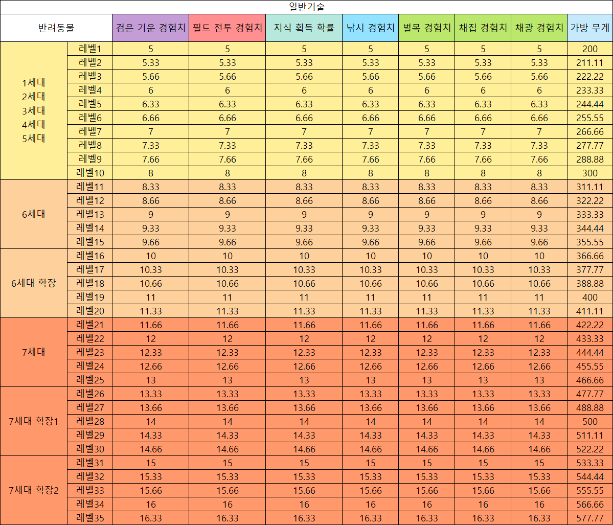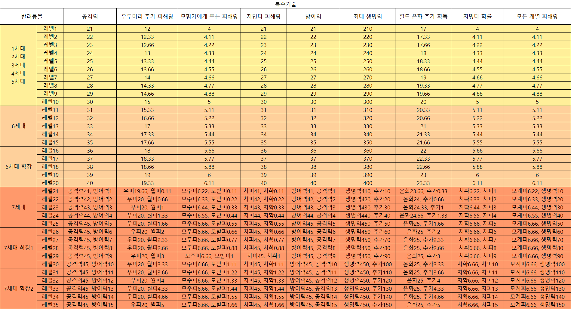 ※ 반려동물(펫) 기술 레벨 수치