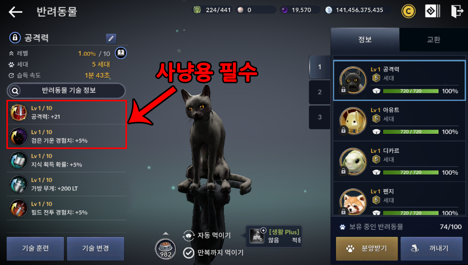 5세대이상 반려동물이 없다면 1~4세대 검은 기운 경험치5% 있는 걸로 꺼내서 사냥하세요.