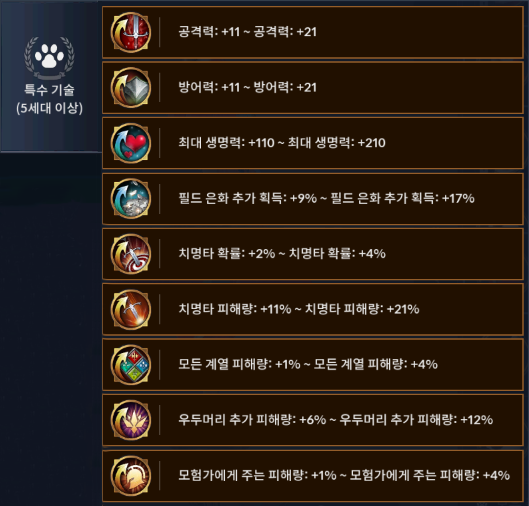 특수기술은 공격력, 방어력, 최대 생명력, 필드 은화 추가 획득, 치명타 확률, 치명타 피해량, 모든 계열 피해량, 우두머리 추가 피해량, 모험가에게 주는 피해량이 있습니다.