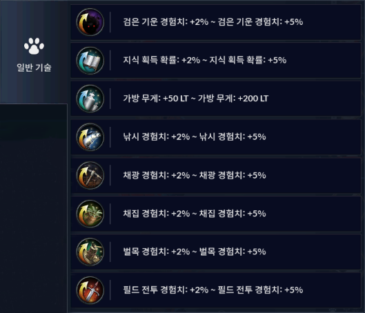 일반기술은 검은 기운 경험치, 지식 획득 확률, 가방 무게, 낚시 경험치, 채광 경험치, 채집 경험치, 벌목 경험치, 필드 전투 경험치가 있습니다.