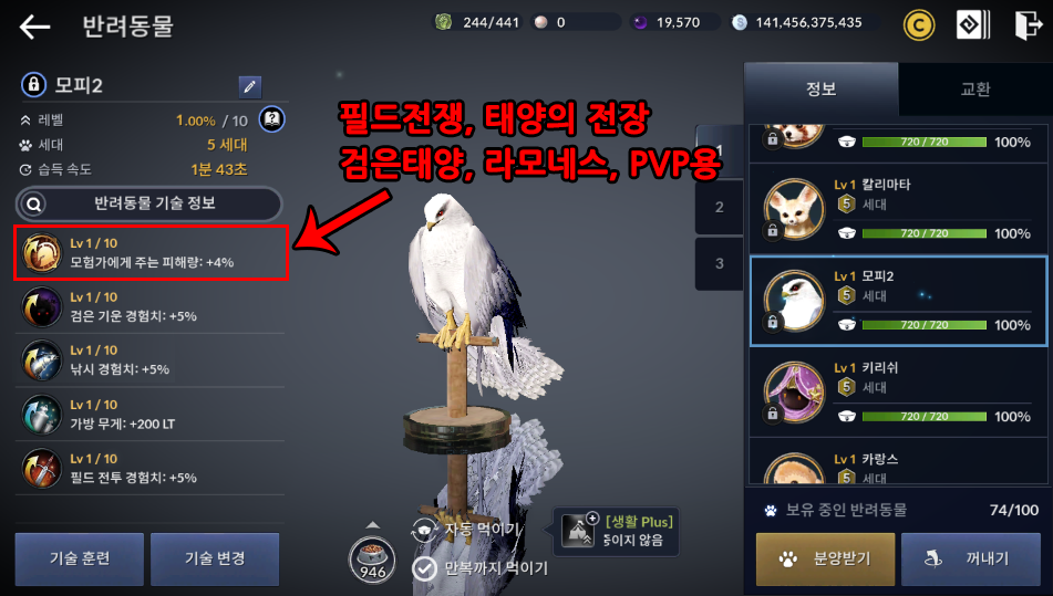 검은사막 모바일 반려동물(펫)은 아이템 습득과 기술을 제공합니다.