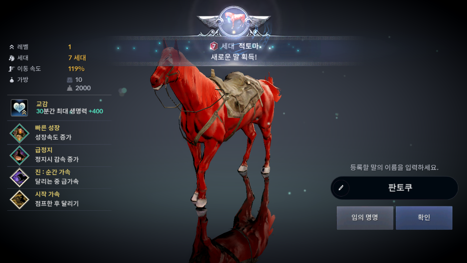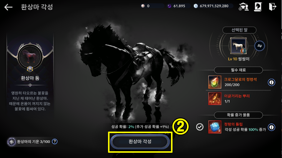 8세대 + 크로그달로의 정령석 200개, 이글거리는 뿌리 1개 = 환상마 (성공 확률 1%)