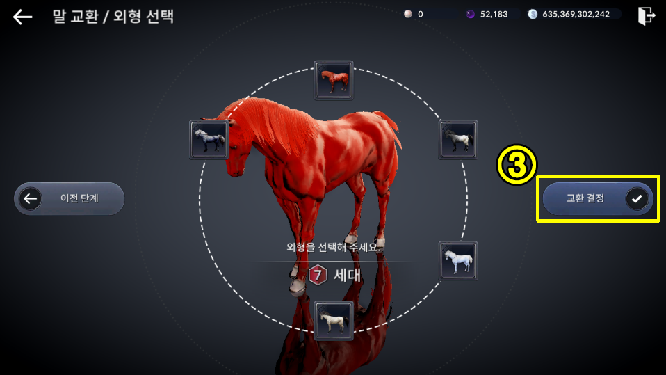 외형을 선택하고 [교환 결정]을 누르면 상위의 말이 만들어집니다.
