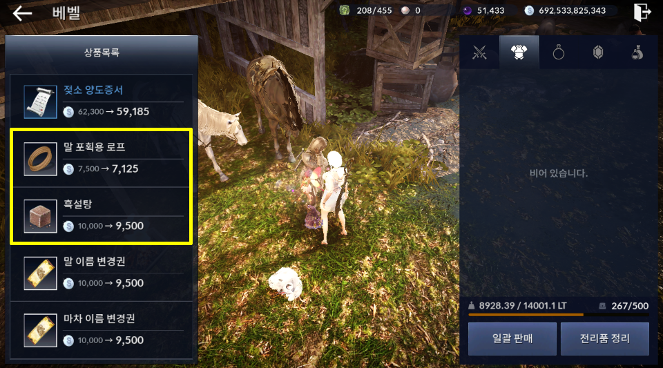 마을의 가축 상인에서 말 포획용 로프하고 흑설탕을 구매할 수 있습니다.
