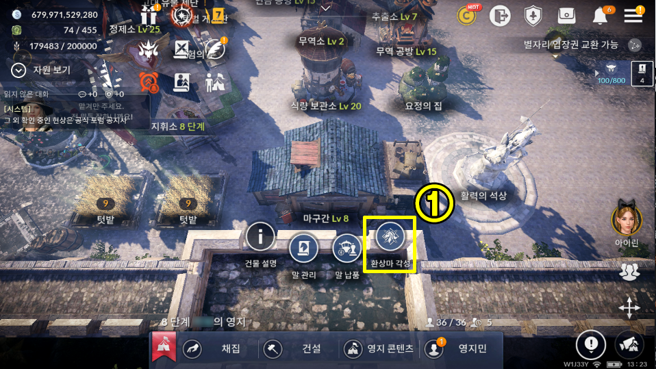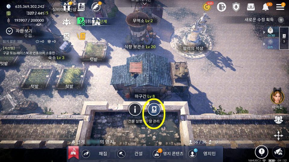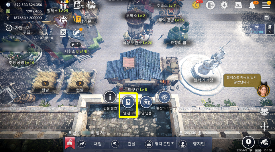 1. 영지에서 마구간을 터치하여 말 관리에 들어갑니다.