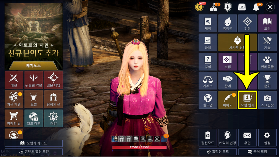 모험 일지에서 퀘스트 얼마나 했는지 확인 가능합니다.