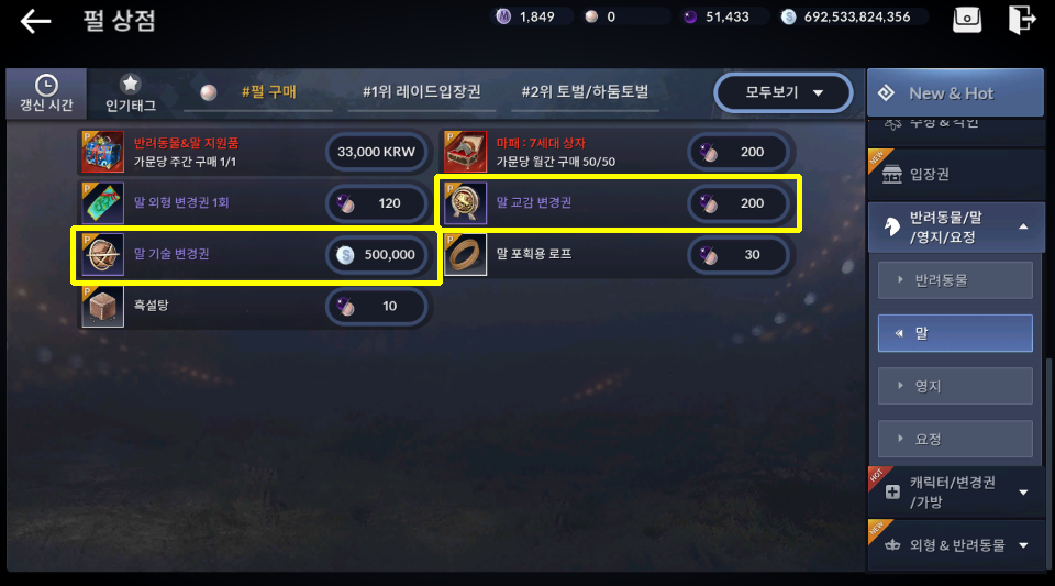 펄 상점에서 말 교감 변경권, 말 기술 변경권 구매합니다.