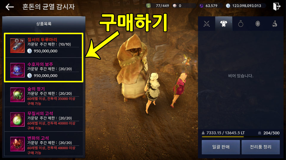 상점에서 질서의 두루마리와 수호자의 보수를 구매합니다.