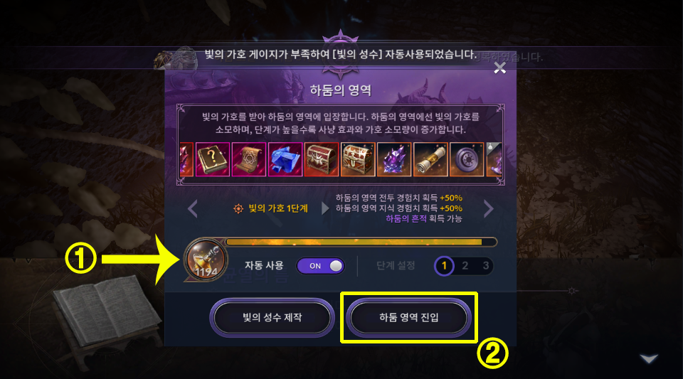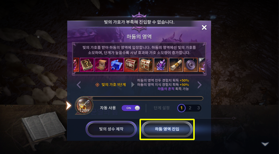 하둠 영역 진입 버튼을 누르면 입장이 안되고 '빛의 가호가 부족해 진입할 수 없습니다.' 라는 문구가 나옵니다.